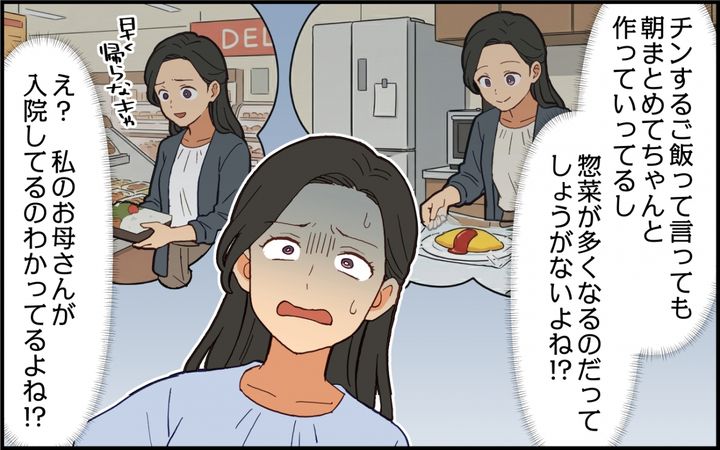 3. 「最近お惣菜が多いし家事を手抜きしてるぞ!」夫の発言が意味不明! 私は実母の介護、あなた協力するって言ったよね!?