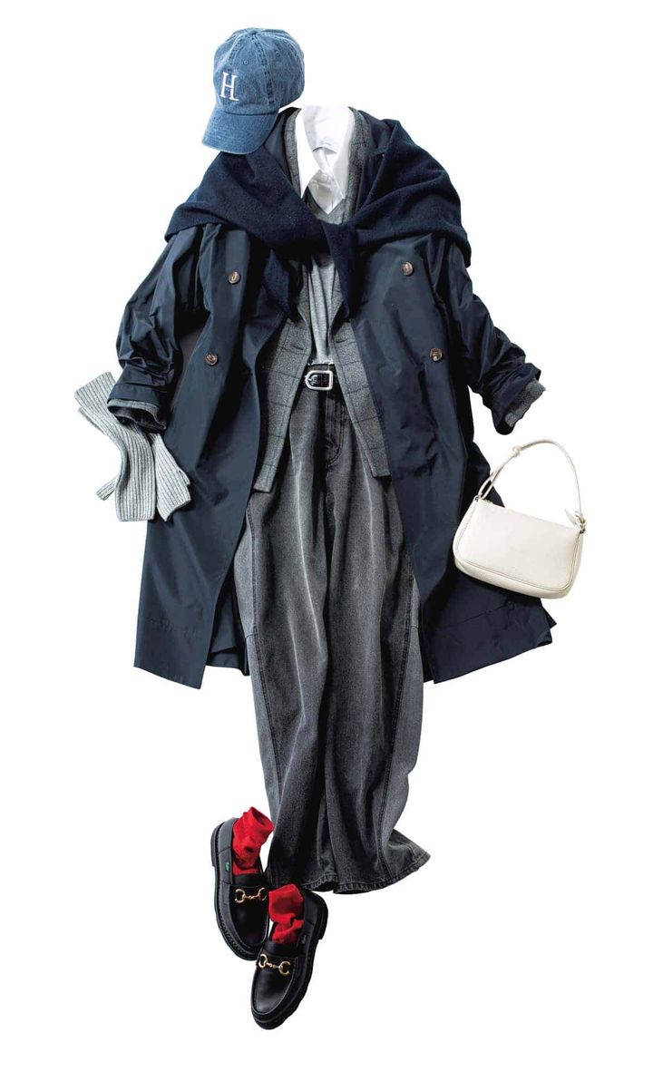 撥水トレンチコート¥132,000(デパリエ 伊勢丹新宿店)ジャケット¥37,400(ミースロエ/ミースロエ ルミネ新宿1店)ニット¥18,700シャツ¥20,900(ともにブロッサム)デニム¥17,930(メゾンスペシャル 青山店)バッグ¥33,000 (ヴァジック/ヴァジックジャパン)シューズ¥96,800(パラブーツ 青山店)ベルト¥52,800(デアンシェ/エスアンドティ)キャップ¥6,490(ヘルシーデニム/ゲストリスト)ストール¥4,990(アンフィーロ)アームウォーマー¥18,700 (アソース メレ/アイネックス)ソックス(スタイリスト私物)