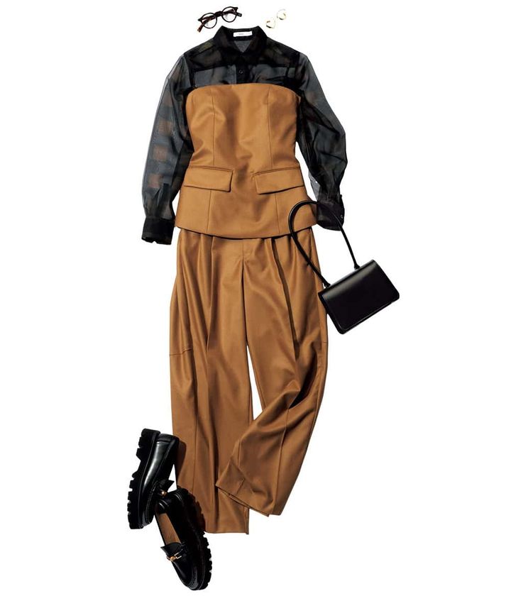 パンツ¥57,200ビスチェ¥49,500ブラウス¥49,500(すべてハイク/ボウルズ)バッグ¥49,500(バケット バゲージ/アイネックス)靴¥32,450(カミナンド/グラビテート)メガネ¥42,900(アイヴァン/アイヴァン 東京ギャラリー)ピアス¥26,400(ココシュニック オンキッチュ/ココシュニック)