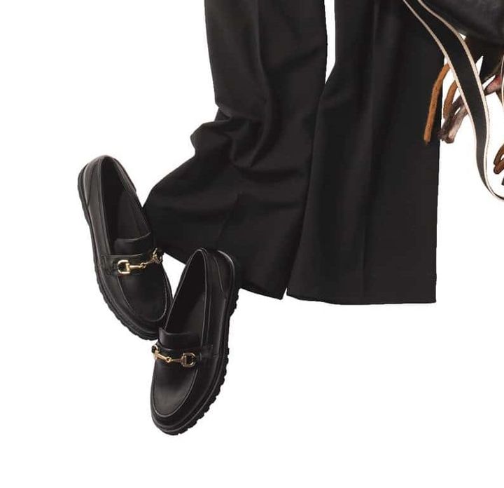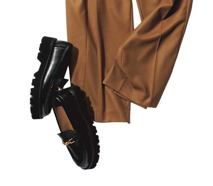 センシュアルなブラウスを重ねたドレッシーなセットアップは、マニッシュなごつめローファーで外すのが正解。上品さを損なわず、絶妙なカジュアルダウンが成功します。黒小物で統一することで、全体の洗練度もぐっと上昇。