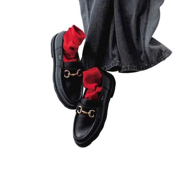 キャップやレイヤードでカジュアルに振った着こなしを引き締めるのは、艶のある黒ローファー。足元に重心を置くことで、ラフに転びがちなスタイリングも自然と整い、ほどよいきちんと感が生まれます。さらに赤ソックスを効かせれば、ローファーの存在感が際立ち、定番アイテム同士の組み合わせでも洒落感をしっかりキープ。