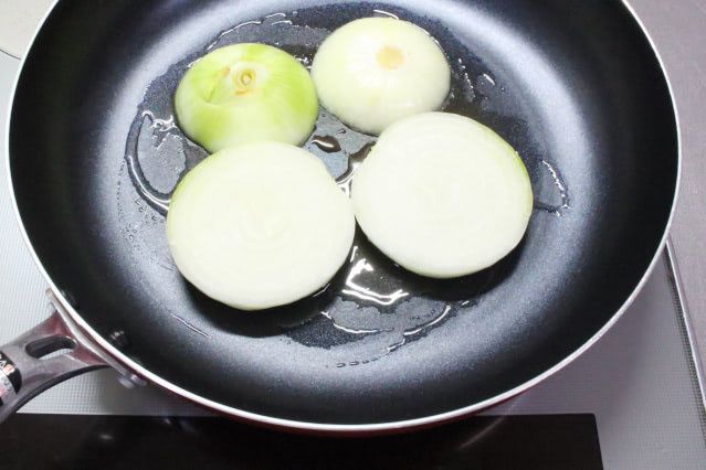 最初の玉ねぎをフライパンに入れた時、玉ねぎを動かして油を全体に塗り広げました。点火前のフライパンなので慌てることもなく、玉ねぎを並べる時にやけどの心配がありません。