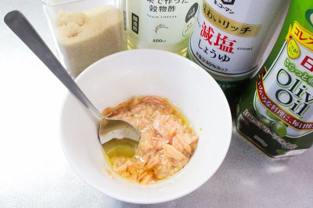 2. 軽く油を切ったツナ、オリーブオイル、しょうゆ、酢、砂糖を混ぜ合わせます。