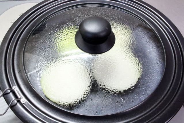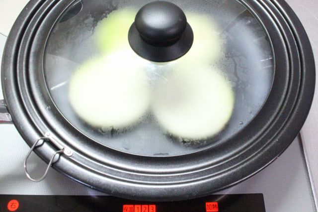 今回は4分ほど追加して加熱。フタの内側に蒸気の水滴がつき、玉ねぎの甘い香りもほんのりと漂ってきました。