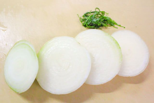 1. 玉ねぎを4等分の輪切りに、青じそを細切りにします。
