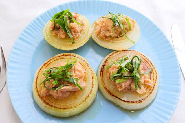 料理研究家・上田淳子さん考案の「タマネギのステーキ ツナソース」が完成!玉ねぎを輪切りにしたことで存在感がとてもあります。