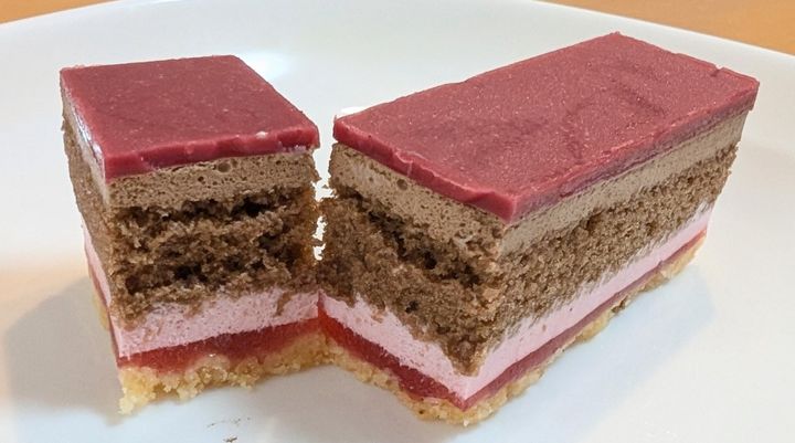 コーティングチョコ・チョコムース・ココアスポンジ・フランボワーズムース・フランボワーズジュレ・クランブルの6層で仕立てた濃厚なオペラケーキです。