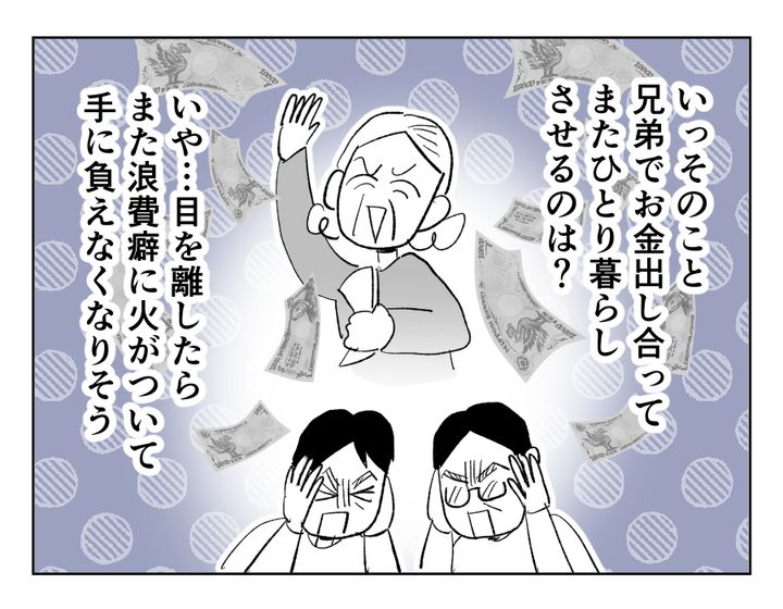 コウタさんだけでなく、義兄も「親には甘く、嫁には厳しい」タイプなのですね……。義姉の解決策も一時的なものですし、きっと義兄に気持ちを抑えつけられているのでしょう。どちらも「金がもったいない」「親は子どもが引き取るのが当然」といった節約&世間体が大切タイプとは、この親にしてこの子ありといった感じですね。