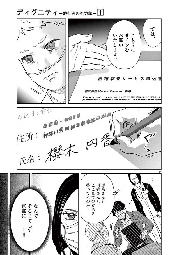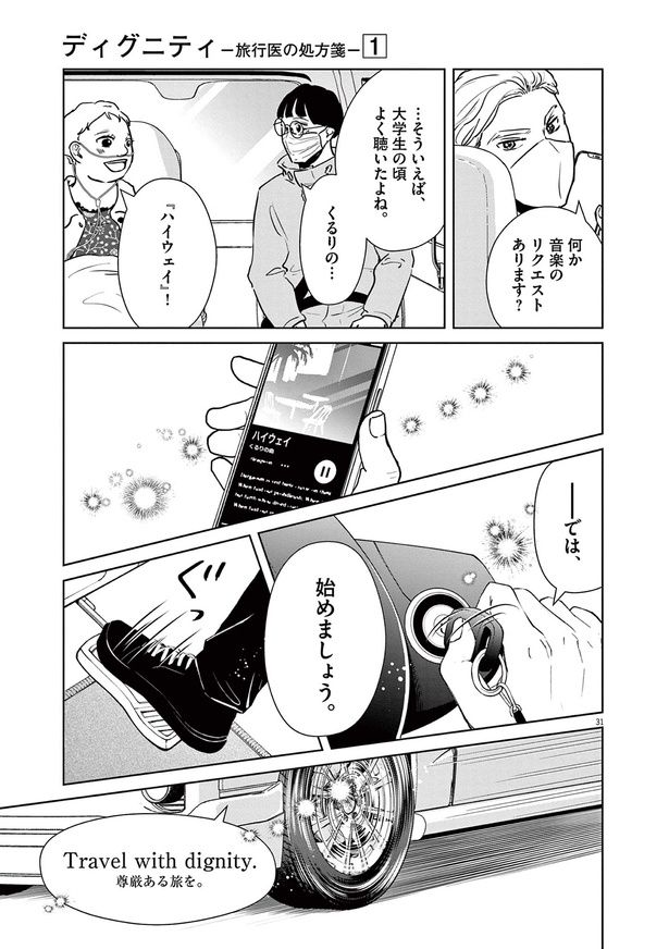 日本において年間100万人が病室で亡くなると言われる現代。看取りの選択肢として終末期患者に旅行を提供する、旅行医の存在をご存知だろうか? 医師が同行する旅行会社「Medical Caravan」を起業&運営する運乗創史もその1人。胡散臭く赤字経営でも、命を懸ける患者のため、彼らは医療に特化した最善の旅行を提供すべく奮闘する――。旅行医監修のもと描かれる医療マンガ『ディグニティ -旅行医の処方箋-』をお届けします。