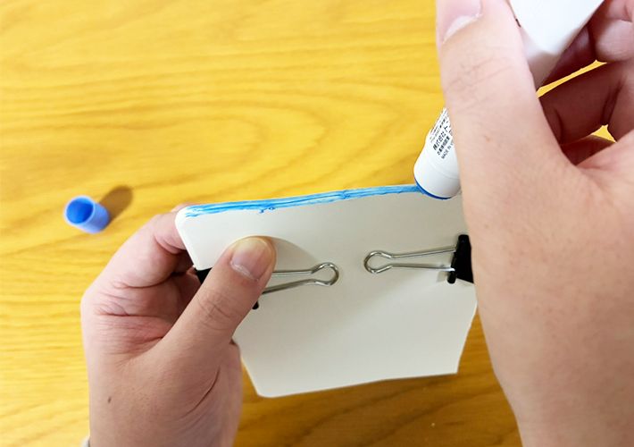 最後に、ドライヤーをのりの部分に当てて乾燥させ、クリップを外せば完成です。