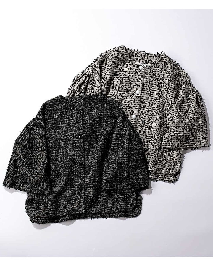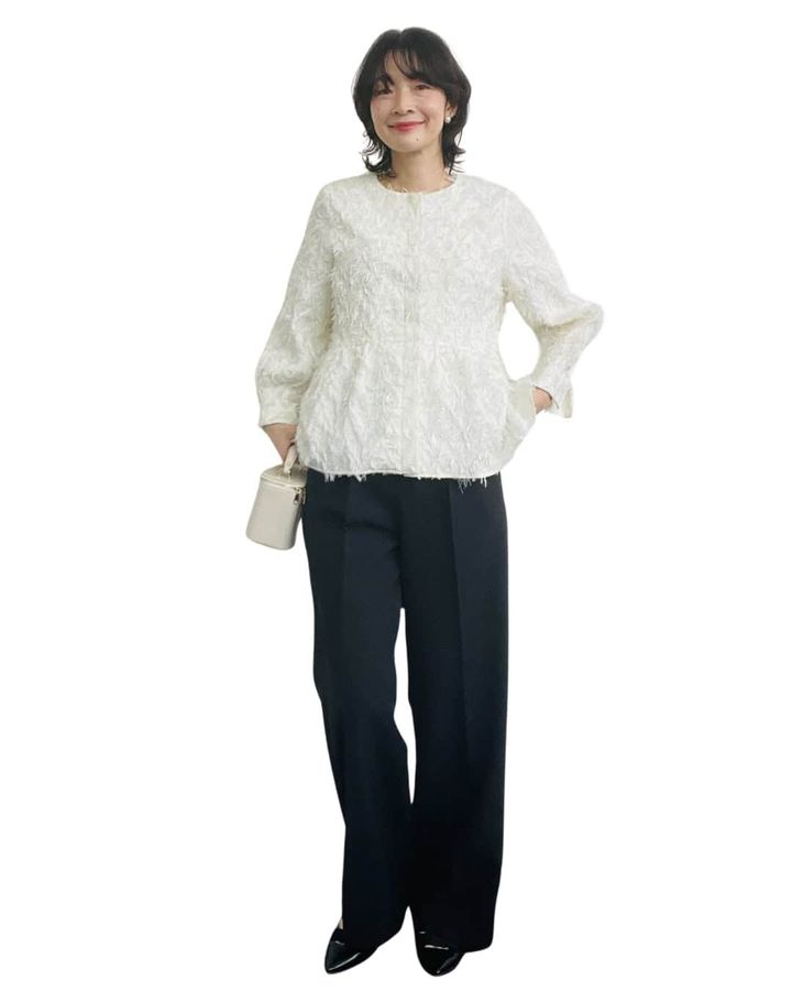 程よいペプラムと毛足の長いジャカード素材で華やかさと高級感が溢れるブラウス。ブラウスとしても羽織りとしても使える!