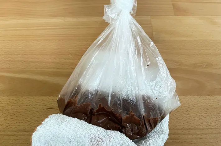 布巾などを使い、袋の上から手で揉むようにしてチョコレートを混ぜると、徐々に溶けていきます。