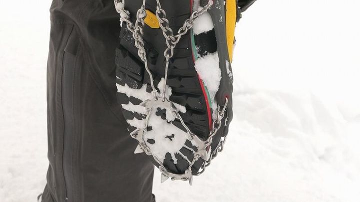 「できるだけ小股であんまり大股になると疲れやすいので、特にアイゼンみたいな刃をつけているときは足の裏全体で雪を捕まえる感じ」