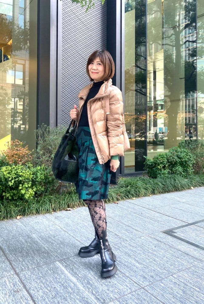 この日は素敵なあの人のイベントに参加していた柴田純子さん。「12月に入ったのでクリスマスを意識してグリーンをメインカラーにコーディネート。ダークトーンのアイテムが多くなったので、今季一目惚れして購入したDoCLASSEの『艶Airダウン』で顔まわりを明るく仕上げました」