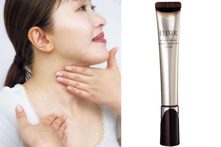 首やデコルテまで、クリームを馴染ませたらマッサージを。年齢が出やすい首は、特に念入りに。右:エリクシール レチノパワー リンクルクリーム ba L [医薬部外品] 22g ¥8,800〈編集部調べ〉(エリクシール)