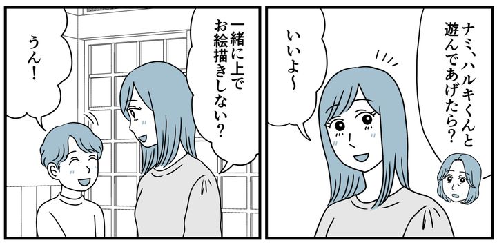 私たちの間には微妙な空気が流れています。私はまず、ナミにハルキくんの相手をしてもらうようお願いしました。昔から小さい子と遊ぶのが上手なナミは、ハルキくんを遊びに誘うと手を繋いで一緒に自分の部屋に上がっていきました。