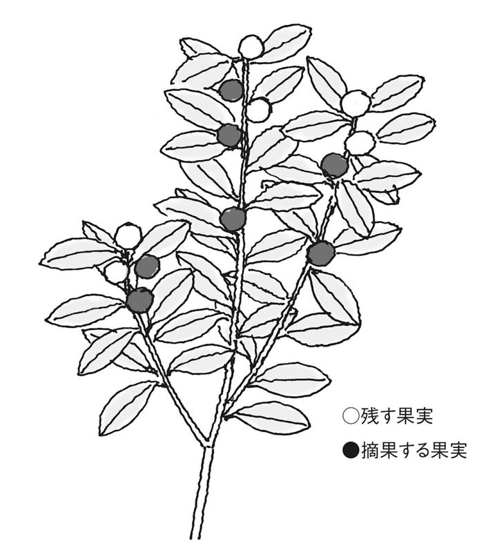 花は充実した短枝の頂部に開花・結実するので3月上旬~中旬の剪定時には枝先を切ることは避け枝条は放任しておくほうがよいでしょう。8月中旬〜9月下旬に小さな果実や変形した果実は摘み取り、大きな果実を残しておくようにします。8月以降に花が咲いたものはたとえ結実しても早めに摘果をし、先に結実した果実の生育のじゃまにならないようにしてあげてください。あくまで7月中旬〜下旬に開花・結実したものを、11月下旬から順次収穫していきます。摘果は9月いっぱいに行いましょう。短い枝の先端部分に5〜7果つきますが、大きくて形のよい果実を15㎝程度の枝で2~3果、残すようにしてください。