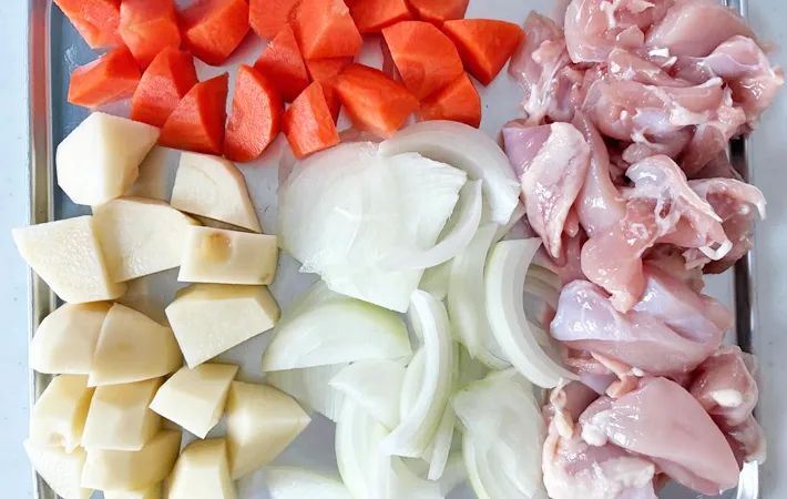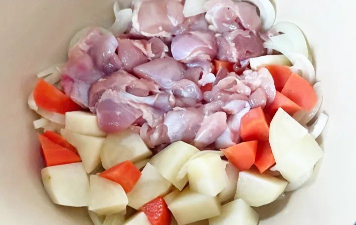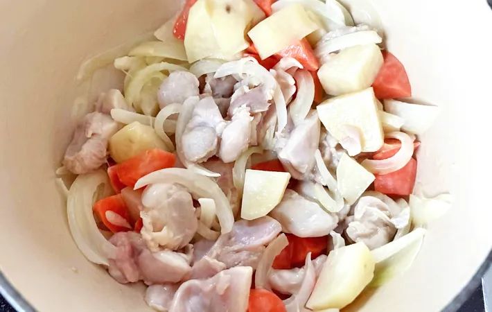 タマネギ、ジャガイモ、ニンジン、鶏もも肉を一口大に切っておきましょう。