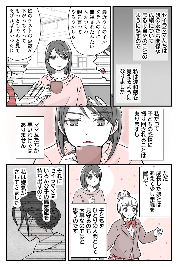 私だって子どもの感情に振り回されることはありますし、それ自体が悪いとは思いません。でも、集まると話題はいつも子どものことばかり。偏差値がどうだとか、友だち関係がどうだとか……。私は中学生になった娘とはあえて少し距離を置いて、子どもをひとりの人間として見守るのも大事なのではと思うのです。