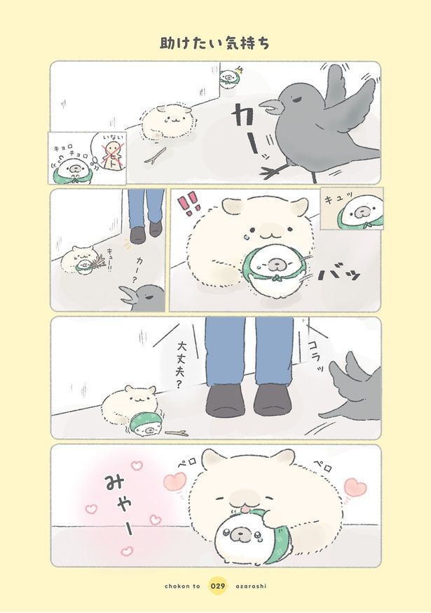 同居人と暮らしている、手のひらサイズの小さなあざらし。二人は、疲れたときにはお互いを励まし合い、うれしいことがあったときは気持ちを共有するかけがえのない存在。アルバイト先では同じ種族の「くろまめ」とも出会い、交流が広がっていく――。SNSでも癒される人が続出! 小さなあざらしと人々のやさしい世界を描いたヒーリングコミック『ちょこんとあざらし』で、癒しのひとときをお楽しみください。