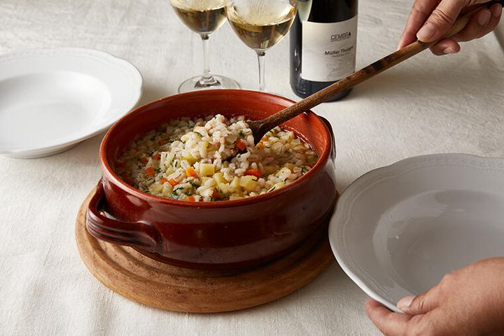 3. 寒い冬の時季にほっと温まる、コルティナ地方の定番家庭料理。麦のプチプチ食感が楽しい「大麦のミネストラ」