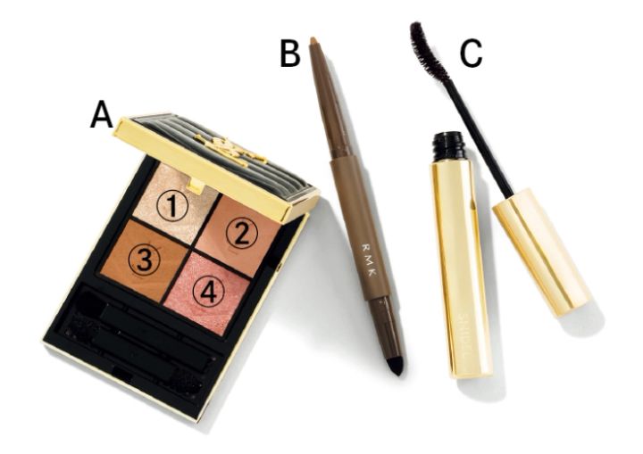色使いに迷ったら、混ぜて1色にしてのせるのがおすすめ。Aの中間色の②と③をブラシで混ぜ、まぶたを囲むようにふわっと色づける。