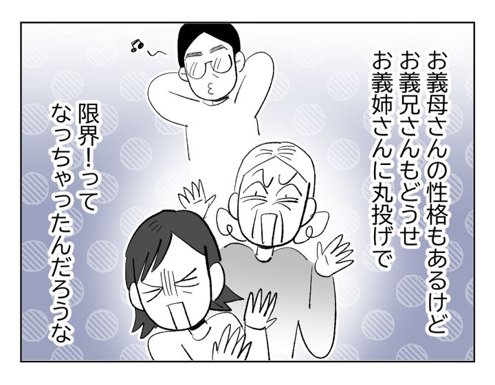 義姉の状況を想像すればするほど可哀想に思えてくるイツキさん。しかしその姿が他人事とも思えないようです。いまの義兄の姿は未来の夫の姿。考えれば考えるほど怒りが増します。現段階ですでに聞く耳をもってくれていないのに、先々自分を優先してくれるわけがない。イツキさんの怒りの炎は消えそうにありません。