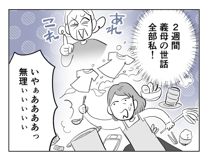 イツキさんはアラフィフのパート主婦。二人の子どもが成人して家を出て、これからはゆっくりしようと思った矢先、義母が2ヶ月に一度、2週間滞在することになりました。実はこの義母、かなり性格がキツくて困った人なので、イツキさんとしてはその滞在を避けたいのですが……夫コウタさんが譲りません。