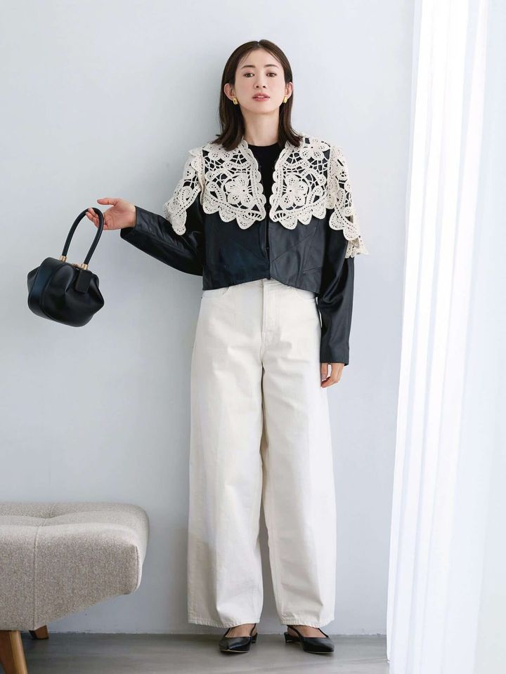 スパイスの効いたレザージャケットをベースにざっくりレースが柔らかさを作ります。パンツも白をチョイスして黒面積を減らすとより軽やかな印象に。シンプルなのに映える甘辛モノトーンコーデは、ママウケバッチリです!
