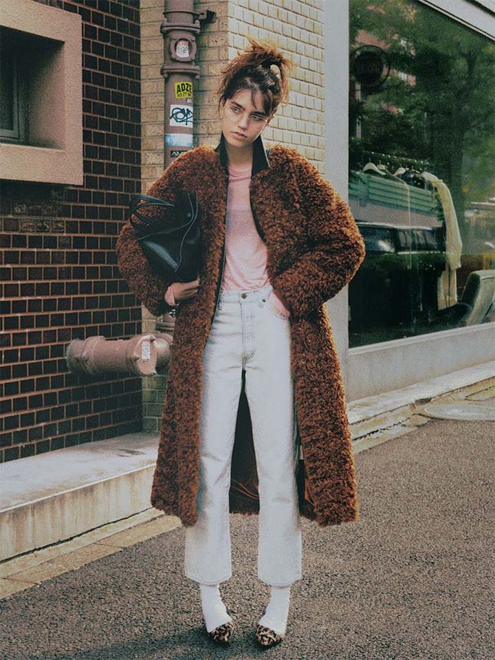 【POINT】ノーカラーの首元にレザーのえりが効いて、ウォーミィなボアがハンサムな面持ちへと変化。インナーにはシアーなロンT、デニムも薄いブルーを選び、アウターを2枚重ねた重厚感をそれとなく引き算。
