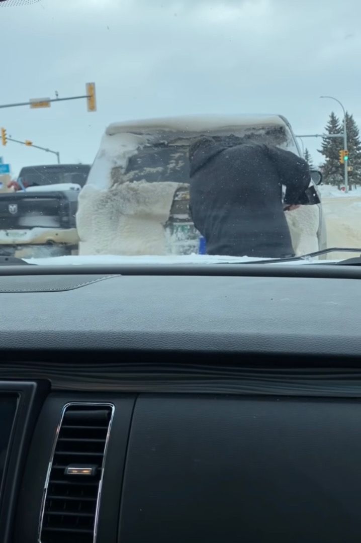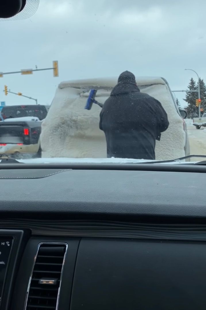そう、男性はそのブラシで、前の車のリアガラスに積もった雪をこすり落とし始めたのです!