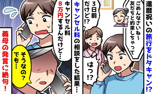 3. 「友だち優先なの」義母が還暦祝いの旅行をドタキャン!キャンセル料8万円…伝えると信じられない発言を!?