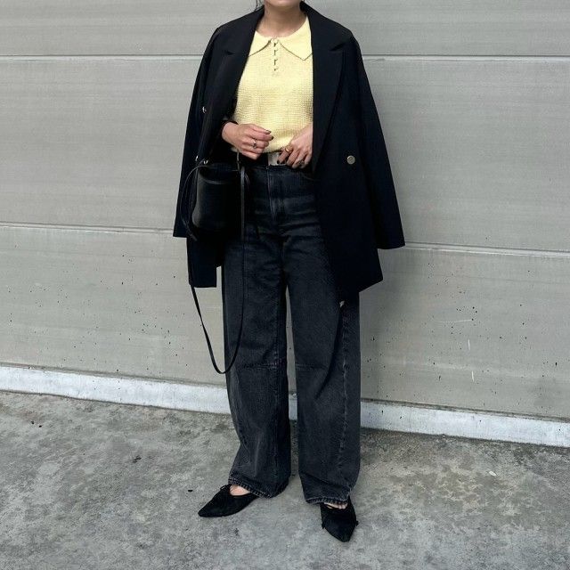 メンズライクなオーバーサイズジャケットだからこそ、甘さをひとさじ足す着こなし方もおすすめ。例えばきれい色のポロニットはぴったり。ブラックデニムパンツを合わせれば、シンプルなアイテムだけなのに旬を感じるスタイリングが完成します。