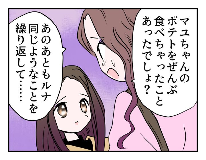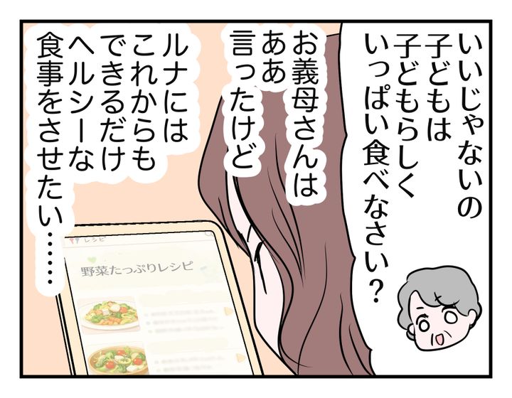 シオンさんは夫と5歳(幼稚園年中)のルナちゃんの3人暮らし。少し前にお義母さんから「成人後のスタイルは幼少期に決まる」と言われ、シオンさんは焦っていました。ぽっちゃりのルナちゃんにダイエットさせようと、お菓子や油ものを禁止したまではよかったのですが……ルナちゃんがお友達のフライドポテトを奪ったり、別のお友達のお子様ランチのフライドポテトをむさぼったりと大変なことに。友達に「子どもの気持ちを考えな」と諭され反省したところで、事の発端となったお義母さんが、自分の発言を忘れているのを知り愕然。人の意見に左右された自身を反省し、ルナちゃんの食生活をあらためて考え直しました。