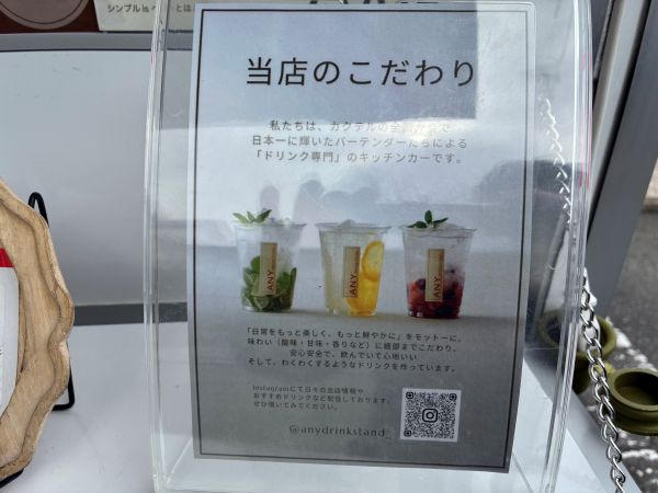 カウンターの端にさり気なく置かれた「当店のこだわり」。 元々、福岡市内の有名ホテルにお勤め‥とのことでしたが、実は カクテルの全国大会で日本一に輝いたバーテンダーたちによる「ドリンク専門」のキッチンカー! 凄いキャリアの方々による本格的なドリンクが期待できます。