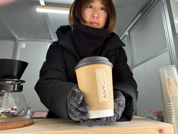 ANY DRINK STANDは、軽トラックをベースとしたコンパクトなキッチンカーです。 後方上部の小窓からマスターとコミュニケーションする構造。 壁面、車体前方には商品を紹介する写真入りのメニューが豊富に掲示されています。