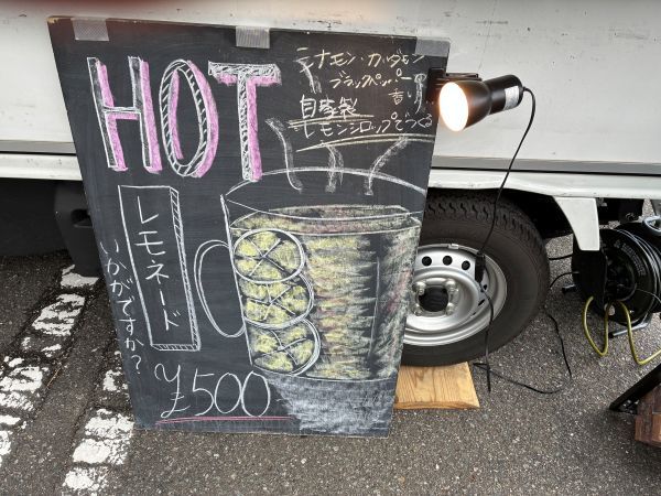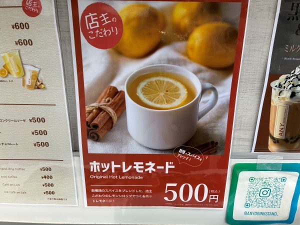 訪問した日は小雪が舞うとても寒い日。 こういう日はホットレモネードに惹かれてしまいます。 POPには、”数種類のスパイスをブレンドした、店主こだわりのレモンシロップでつくるホットレモネード!” スパイス?? カレーのスパイスは想像できるけど、レモネードにスパイスって何のこと??