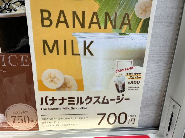 目に留まるバナナミルクスムージーのPOPが気になって仕方がありません。 完熟バナナとミルクの濃厚スムージー‥は、食いしん坊にはオーダーせずにはいられませんでした。