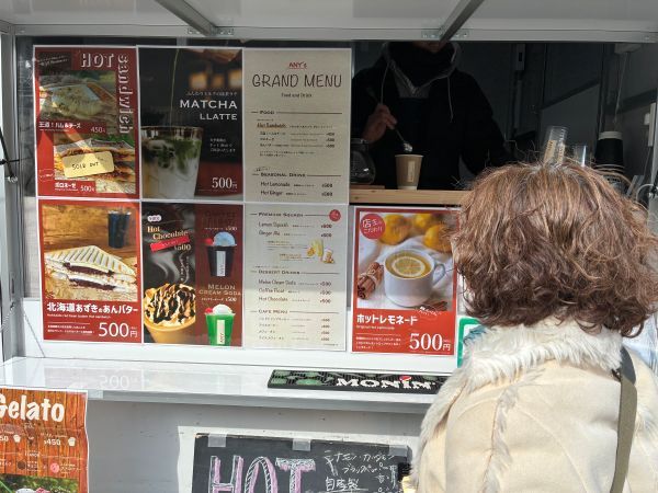 ドリンク類の他、ホットサンドイッチ、ジェラートなど色々な商品展開。 決めるまでに時間が掛かりますが、最高に楽しいひと時を過ごすことができます。