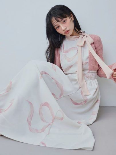 リボンプリントをあしらったボウタイワンピースとニットカーディガンのセット。ノースリーブワンピースは、ハイウエスト位置で切り替えを入れたAライン。デートや春のお出かけが待ち遠しくなるデザインです。