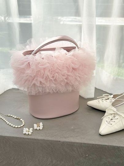 サテンあるかご素材のコンビバッグにチュールを施した、エアリーでドラマティックなデザインが魅力。ワンハンドル仕様で持ち面もキャッチーに映え、ショルダー付きで2WAYで楽しめるのも嬉しいポイント。