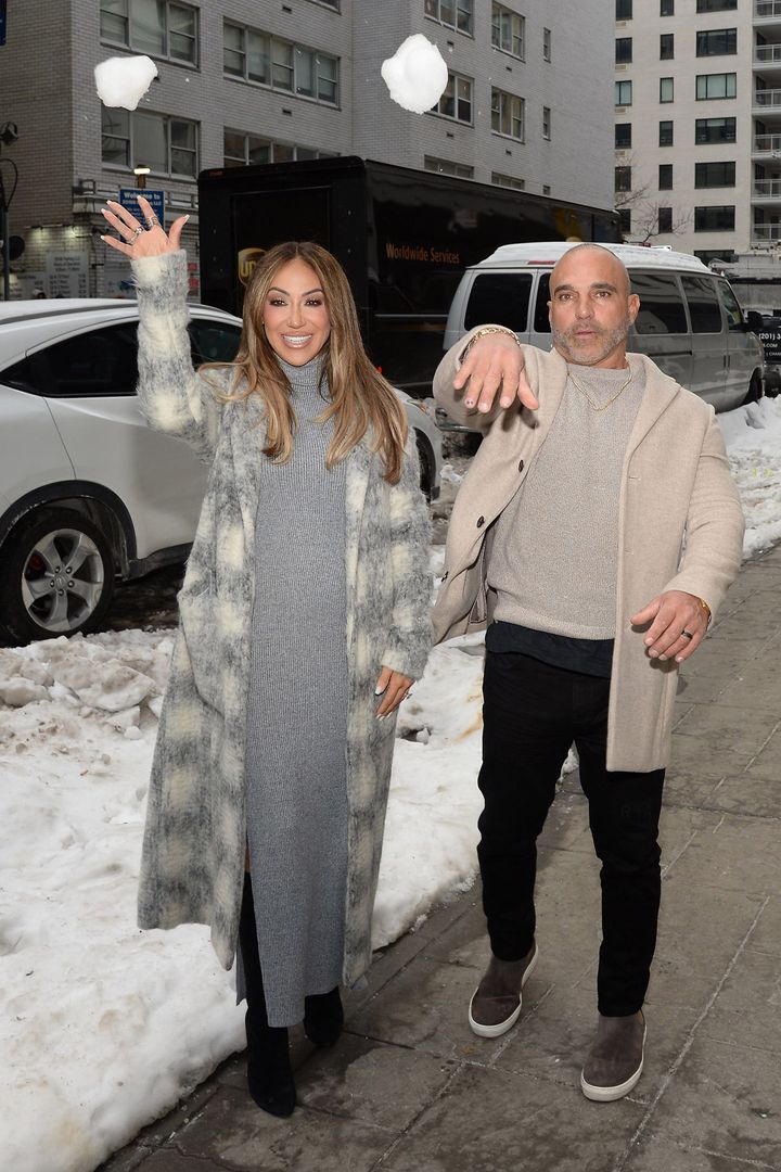 仲睦まじい様子を見せたメリッサ・ゴルガ(46)夫妻。グレーでイメージを統一し、温かみのあるロングコートで防寒とおしゃれを両立。思わず雪合戦をしたくなってしまうほど動きやすく、スタイリッシュな印象。