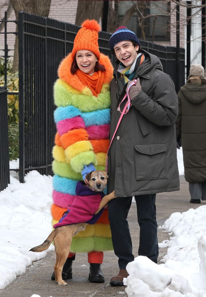 ドラマ『エルズベス』撮影中のキャリー・プレストン(58)と、ベン・レヴィ・ロス。目の覚めるような鮮やかなレインボーのコートは、雪の日の気分を上げてくれる。完璧な防寒で、寒さも吹っ切れる!