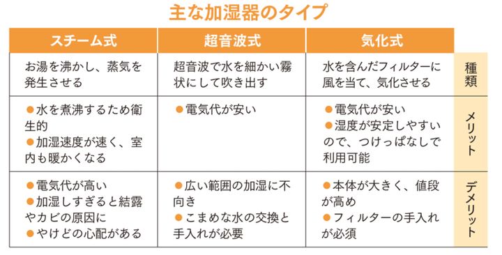加湿器は、湿度が安定し広い部屋向きの気化式、室温を下げないスチーム式、デスクやベッドまわりなど狭い範囲向きの超音波式などがあるので、場所に合わせて上手に選んで。