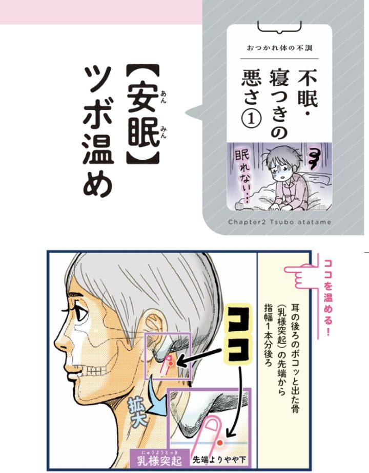 今回は『ピンポイントで整う!押し活』第2章「おつかれ体の不調 ツボ編」より、温めてケアする「ツボ温め」より【安眠】に関する効果的な押し活をご紹介します。