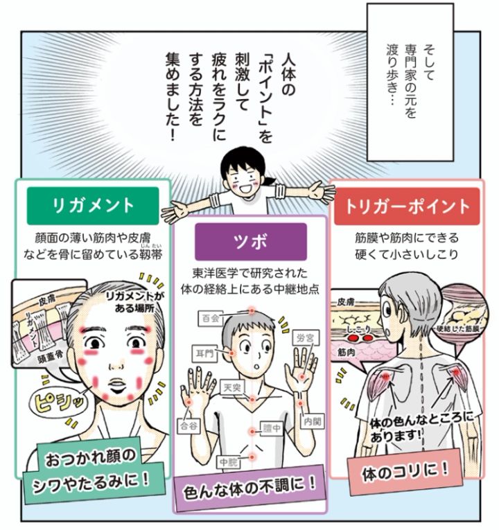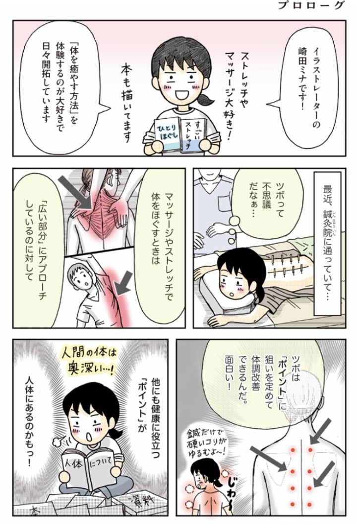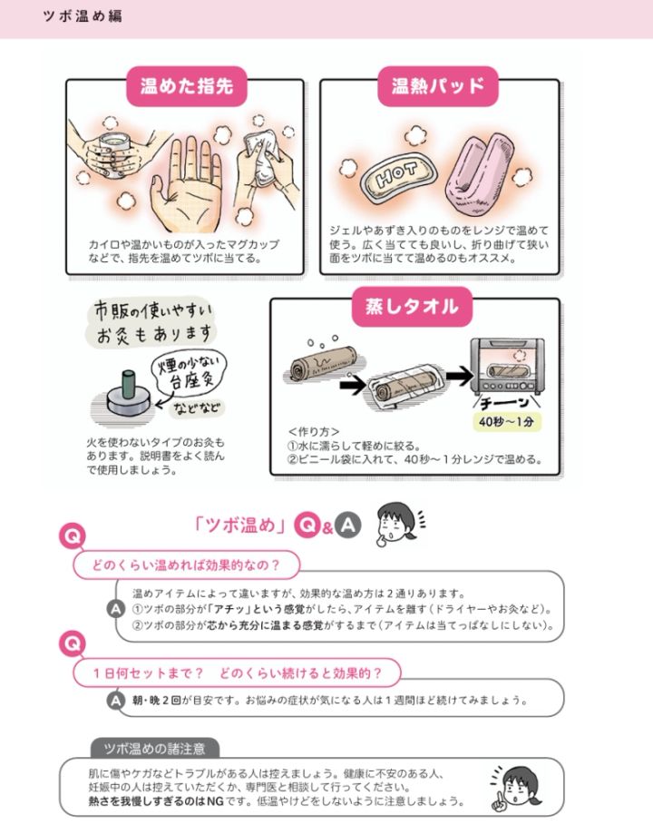 筆者の崎田さんが実際に鍼灸院で施術を受け、東洋医学のツボ療法の効果を実感したといいます。そこから、自分でできるツボ押しについて取材を行い、セルフケアをまとめたのが「ツボ編」です。