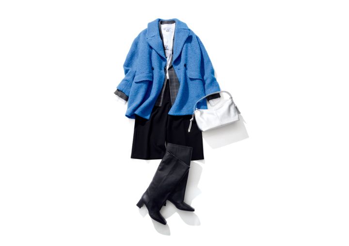 コクーンコート¥57,200/ルーニィ プリントTシャツ¥18,700/スリードッツ(スリードッツ表参道店) バミューダパンツ¥7,990/ZARA(ザラ) ジャケット¥17,990/ANYSIS(オンワード樫山) シルバーバッグ¥15,400/Stola. ロングブーツ¥79,200/ファビオ ルスコーニ(エリオポール代官山)