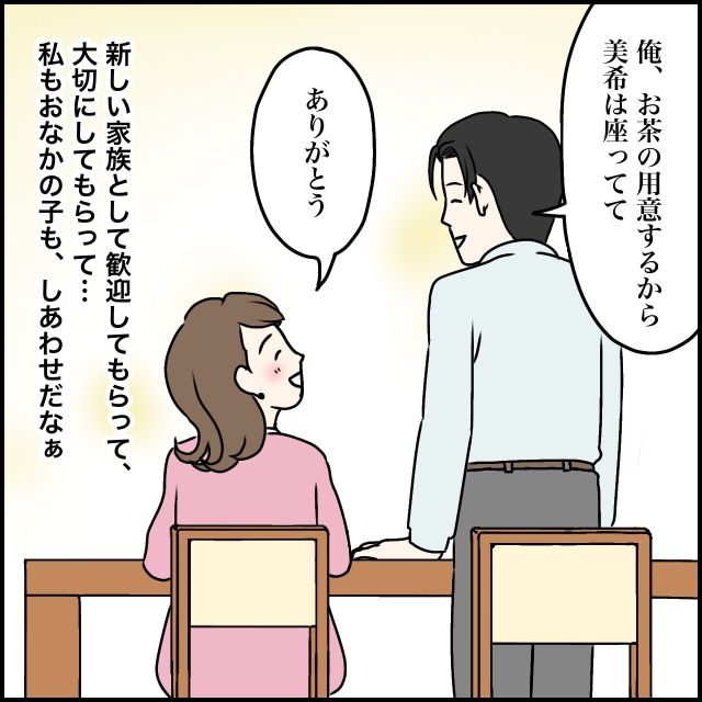 太一は周りからも「愛妻家」と言われるように、いつも本当にやさしい夫で「お茶の用意するから美希は座ってて」と気遣ってくれます。新しい家族として歓迎してもらって、大切にしてもらって。私はもちろんのこと、お腹の子も幸せだなぁとかみしめていると、ダイニングのドアが開きました。あぁ、今日もいるのね。
