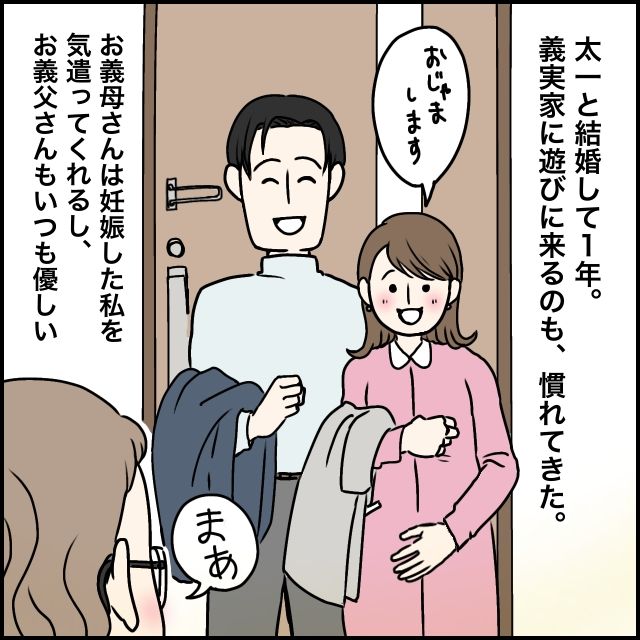 太一と結婚して1年。私は幸せな結婚生活を送っています。太一は付き合っていた頃と変わらずずっと優しいし、お義母さんは妊娠中の私を気遣ってくれるし、お義父さんもいつもとっても優しいから、義実家に遊びに来るたびにやっぱり幸せだな、と思います。