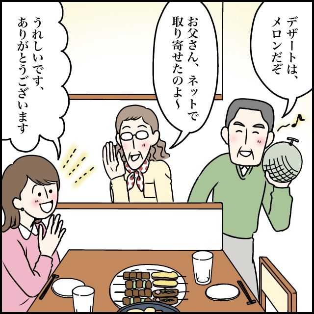 お義父さんも、私の大好きなメロンを用意してくれていました。「お父さん、ネットで取り寄せたのよ~」と言うお義母さんの隣で「デザートはメロンだぞ」と笑顔で見せに来てくれるお義父さん。2人のやり取りがほのぼのとしていて、なんだかかわいらしくて、私も自然に笑顔になります。